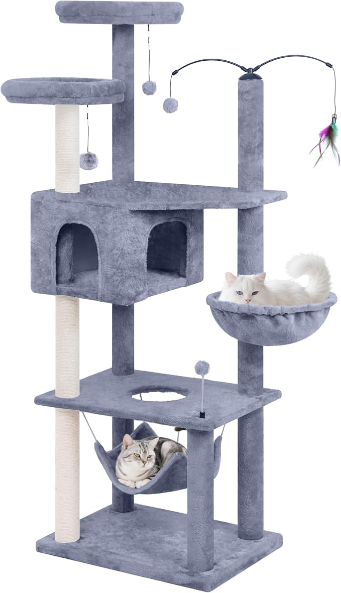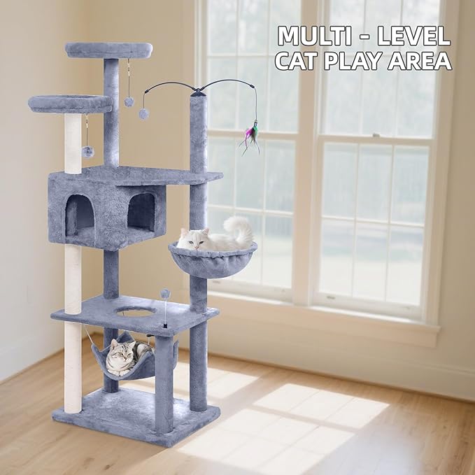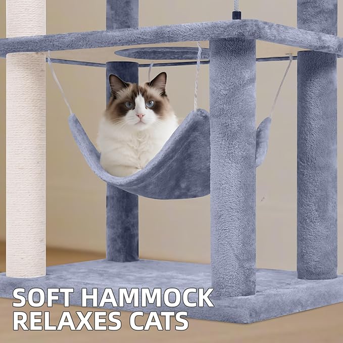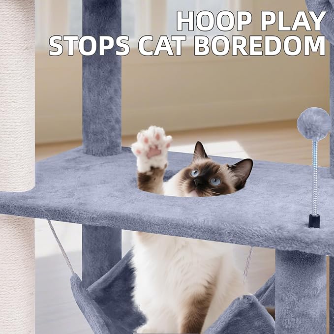 70” Big Cat Tree, Cat Tower with Multi-Level Condo, Hammocks, Rotating Toy, Grey