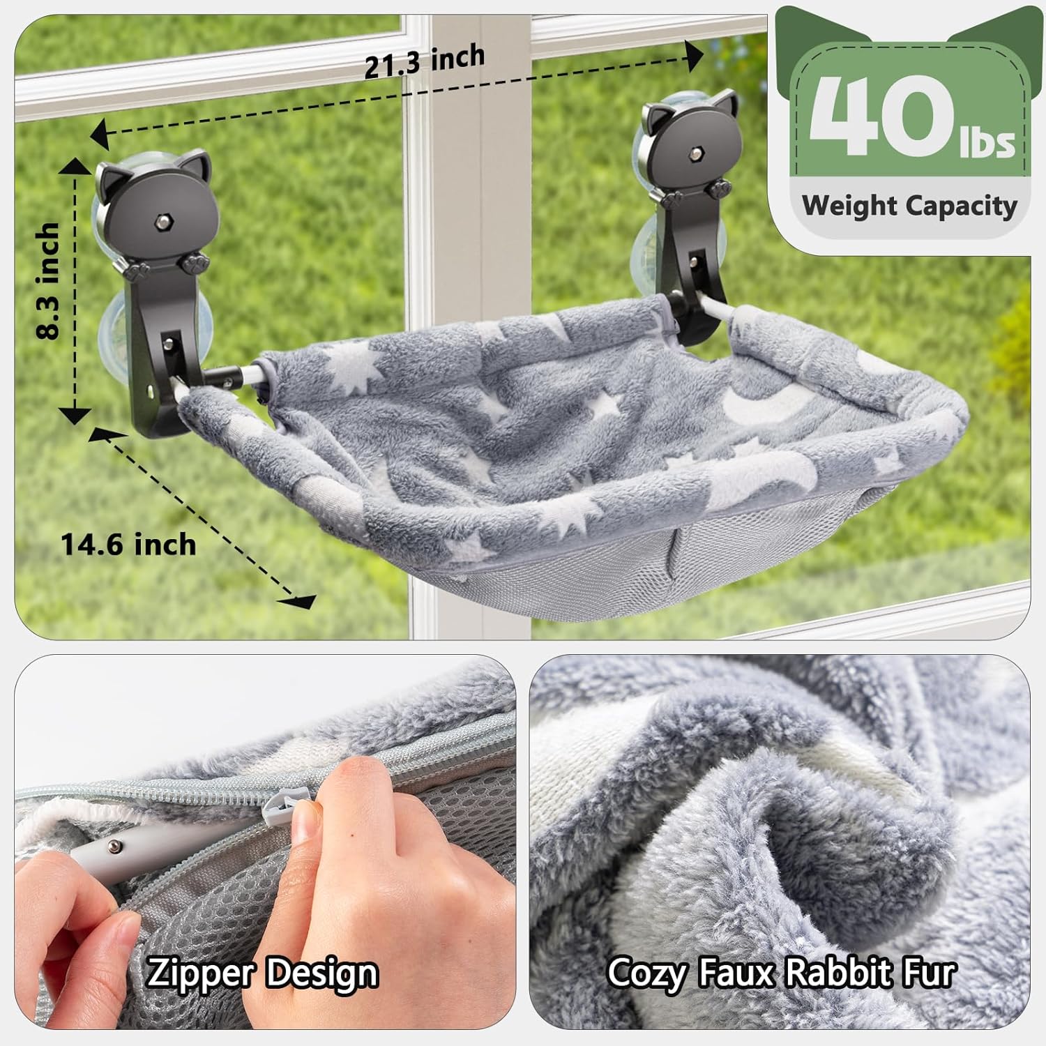 - [Zipper design & Multi-seasonal Use] The cover that comes with this cat hammock is designed with a zipper that is easy to install and remove. There are a total of two materials to choose from, the mesh material is breathable and keeps your cat cool and comfortable in the hot summer, and in the fall and winter you can use the faux rabbit fur material, which is soft and warm and provides a cozy resting environment for your cat in the cold season.