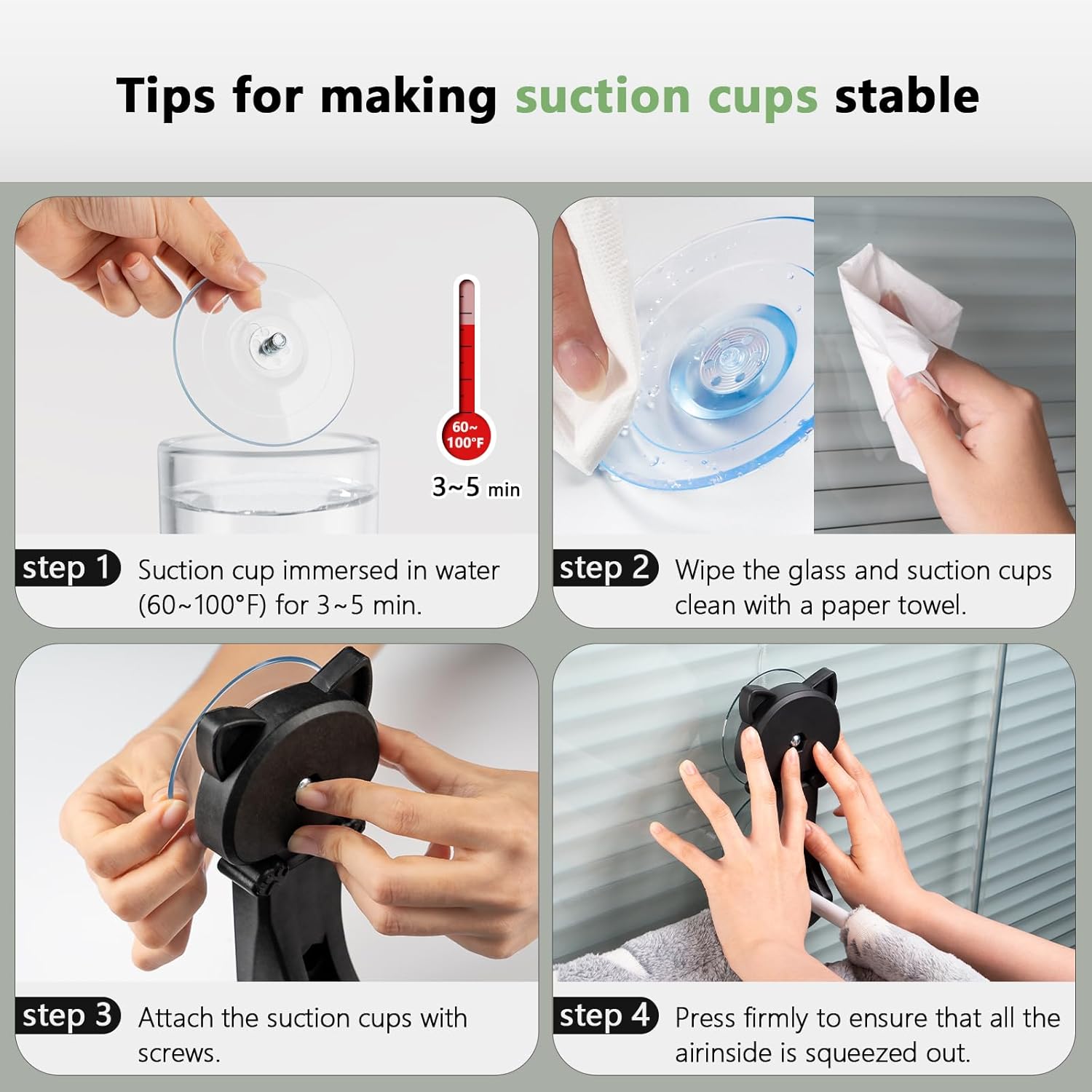 - [Pre-Installation Tips] To ensure the suction cups stick firmly to the window, soak them in hot water for 3 minutes to soften them. Dry them until they are just slightly damp, and clean the window. Apply the suction cups to the window and press firmly to squeeze the air.