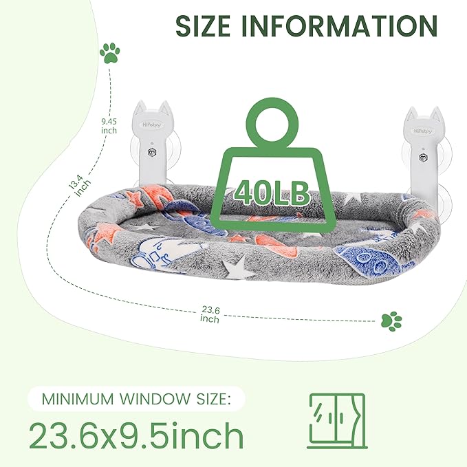 【Cordless Cat Hammock】 HiPetpy cat window perch measures 19.88 x 14.17 x 9.45 inches and supports cats weighing up to 40 lbs. Its cordless installation allows your cat to jump up and down freely.