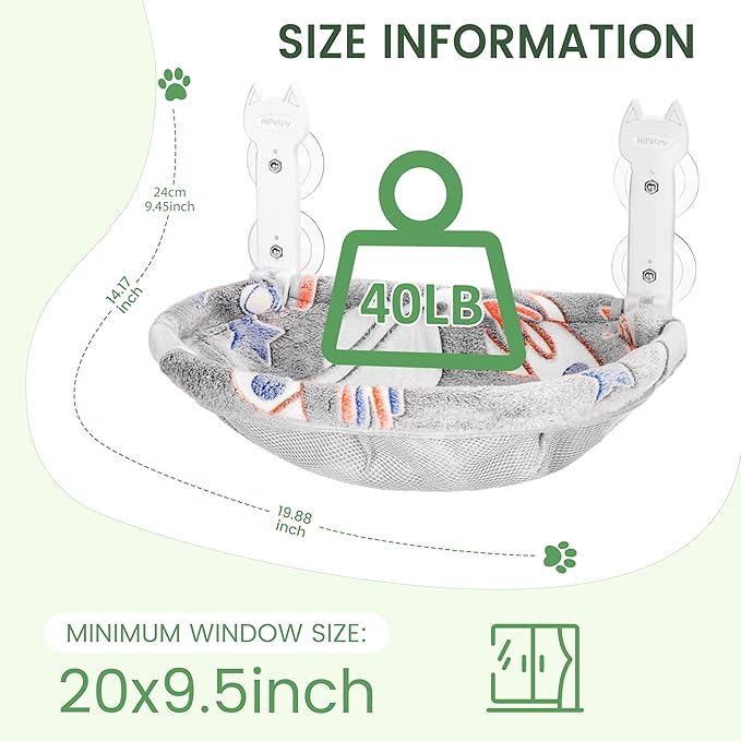 【Cordless Cat Hammock】 HiPetpy cat window perch measures 19.88 x 14.17 x 9.45 inches and supports cats weighing up to 40 lbs. Its cordless installation allows your cat to jump up and down freely.
