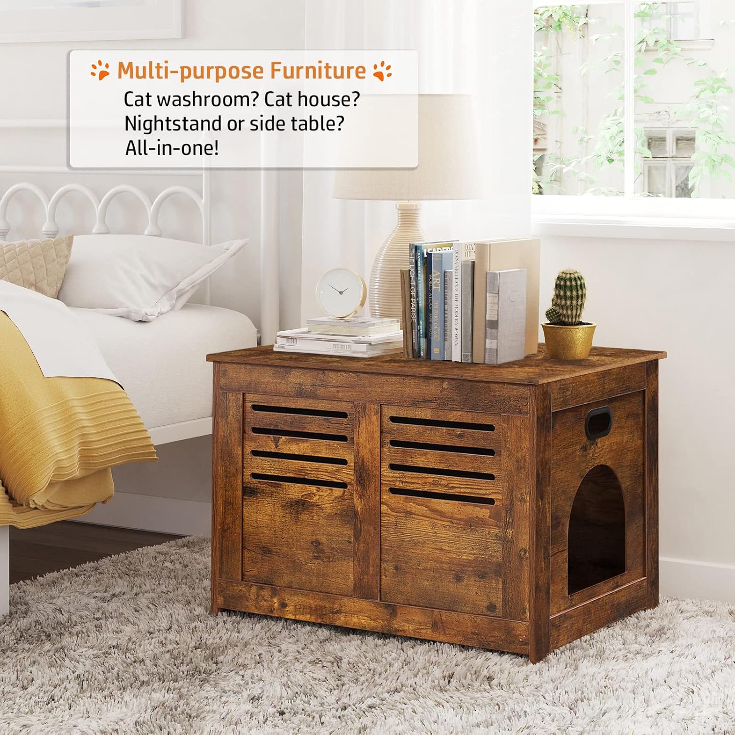 - 【Versatile Cat Furniture】Appealing appearance can blend well with any home decor. It can be used as a decorative wooden litter box. cat home, as well as an end side table. Transforming the eyesore cat’s toileting area into an eye-catching one. Flip lid is perfect for elderly or those who struggle with squatting or limited mobility