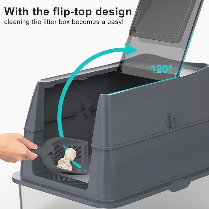 - ENGINEERED FOR STRESS-FREE SCOOPING:No dismantling required! This stainless steel litter box with lid features a reinforced 120° flip-top that stays securely open during scooping. Enjoy effortless daily cleaning with the included litter box set.