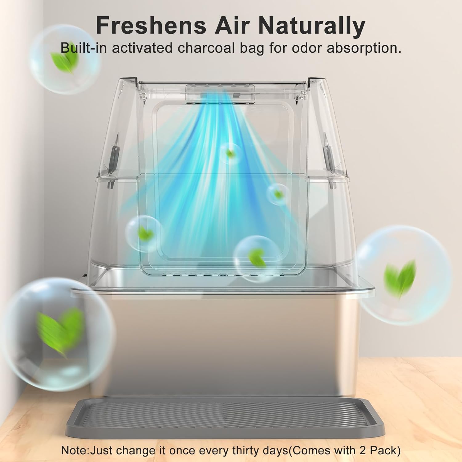 - ODOR-FIGHTING CARBON ZONE:The top of this stainless steel cat litter box with lid has a dedicated area for charcoal bags to neutralize ammonia smells. (Note: Change bags once every thirty days – Comes with 2 Pack). A must-have feature for any enclosed stainless steel litter box.