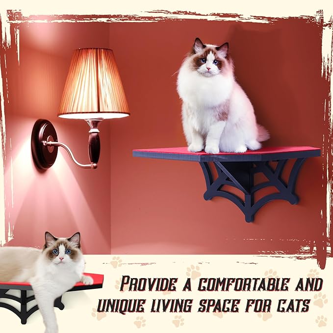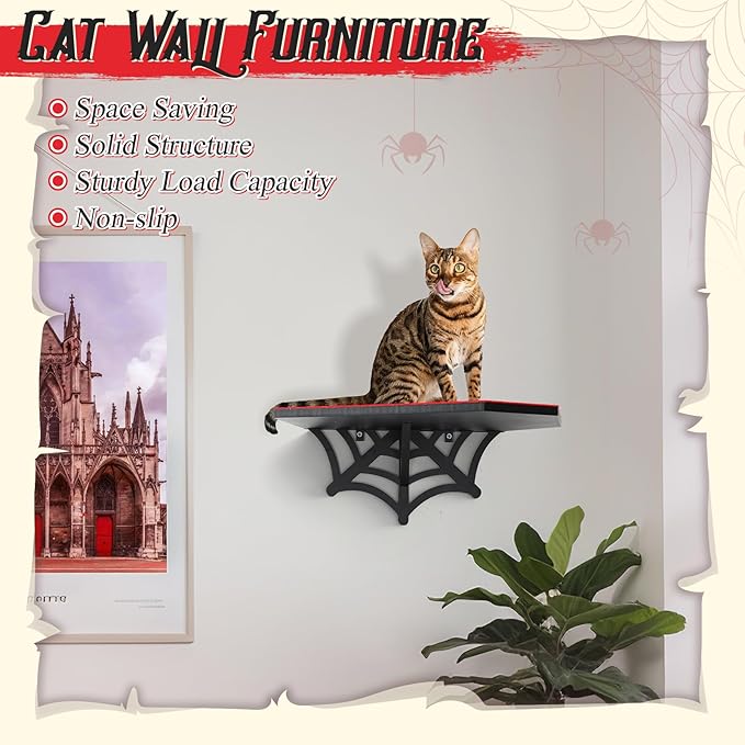 - Halloween Gothic Design: this Halloween cat wall shelf features a gothic design that incorporates Halloween elements, spiderweb, coffin, plush velvet, red and black color, adding a touch of gothic charm and Halloween ambiance to your space with this visually cat wall furniture