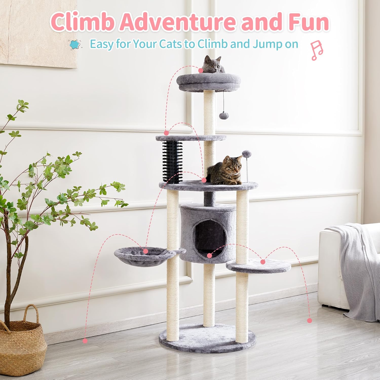 • All-in-One Playground: The tall cat tree is an entertainment center that can stimulate cats’ curiosity and playfulness with climbing platforms, playing balls, and hiding in the cat house