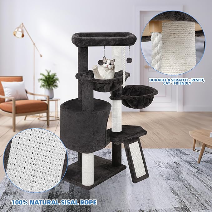 - High quality faux fur, natural sisal posts durable for long time scratch by cats.
