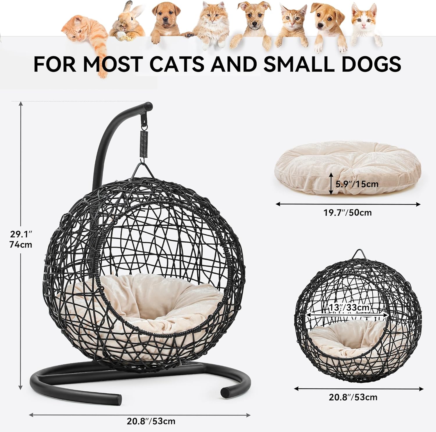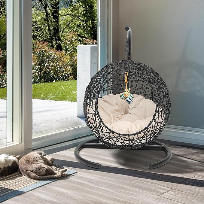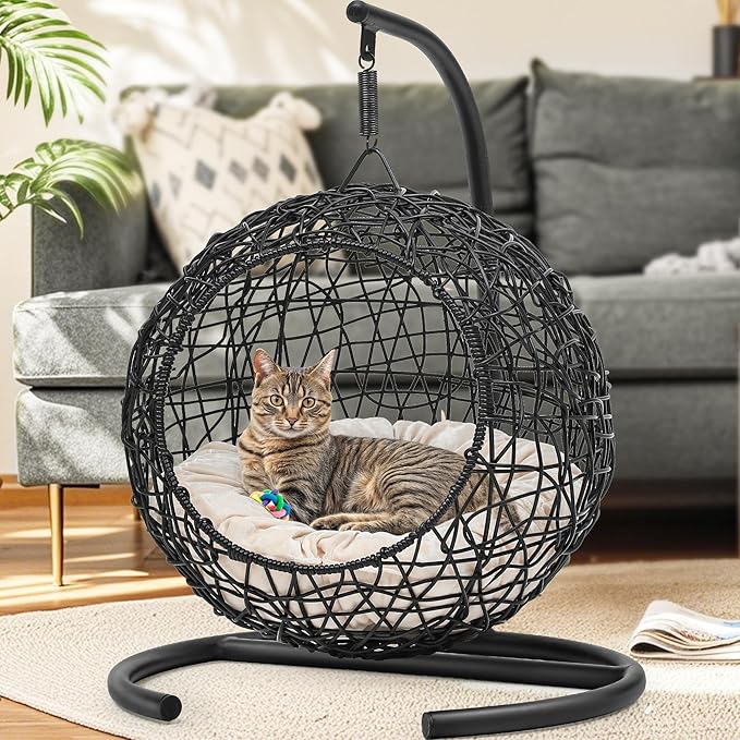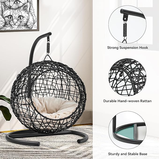 YITAHOME Cat Swing Bed with Stand & Cushion, Cat Egg Chair with Rattan Wicker Appearance, Indoor Hanging Swinging Cat Bed for Cats, Small Dogs, and Small Animals, Black